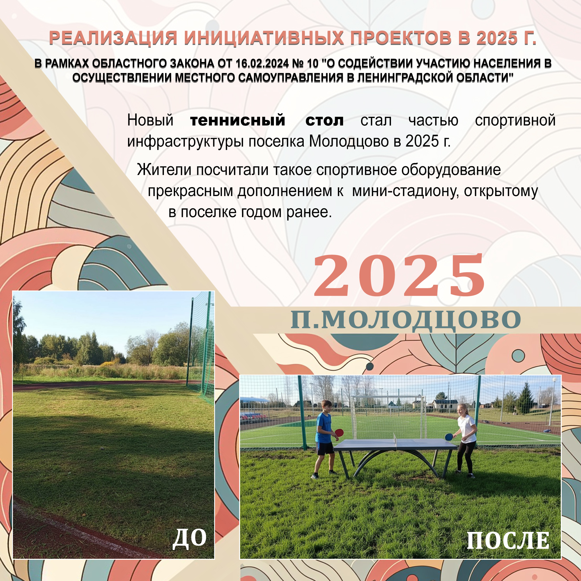 | 2025 | Реализация инициативного проекта за 2025 г. в рамках областного закона от 16.02.2024 № 10 "О содействии участию населения в осуществлении местного самоуправления в ленинградской области" (Молодцово) | 223 200,00 | 88 461,00 | 403,06 | 311 661,00 |